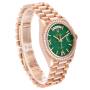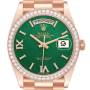 Dial: Green aventurine dial set with original Rolex factory diamonds. Original Rolex factory diamond-encrusted rose gold Roman numeral hour markers. Rose gold hands. Date calendar at 3 o'clock aperture and day-of-the-week window at 12 o'clock, both enclosed in rose gold.