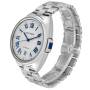 Replica Cartier Cle Silver Dial Steel Automatic Mens Watch WSCL0007. Automatic self-winding movement. Stainless steel round case 40.0 mm in diameter. Transparent exhibition sapphire crystal caseback. Flush-mounted crown set with the blue spinel cabochon. Stainless steel smooth bezel. Scratch resistant sapphire crystal. Silver Flinque, sunray effect dial with a guilloche patterned center. Blue radial Roman numeral hour markers and blued steel sword-shaped hands. Minute markers around the outer rim. Date window at the 6 o'clock aperature. Stainless steel bracelet with a double deployant clasp. Fits a 7" wrist.