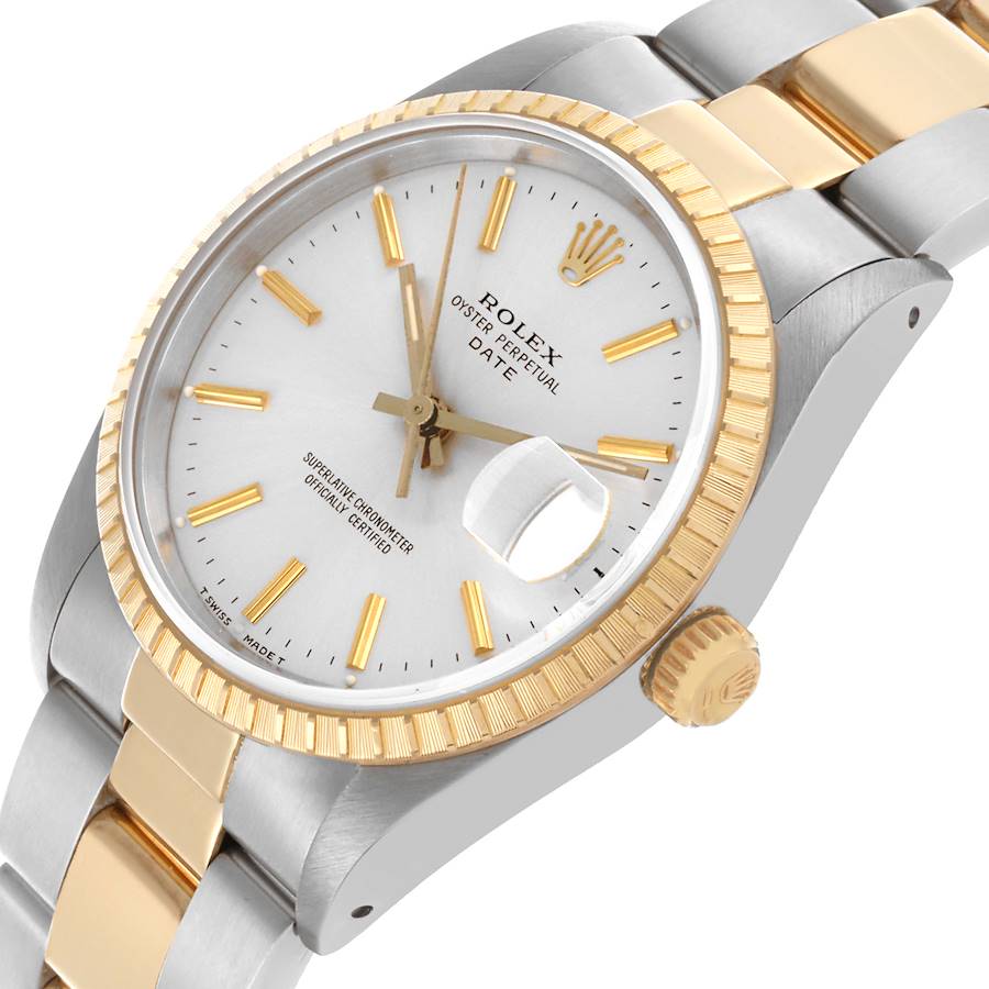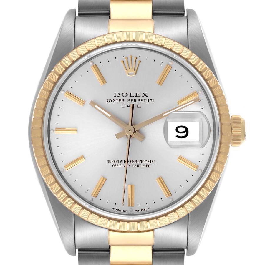Replica Rolex Date Steel Yellow Gold Silver Dial Mens Watch 15223. Officially certified chronometer self-winding movement. Stainless steel and 18K yellow gold oyster case 34.0 mm in diameter. Rolex logo on the crown. 18K yellow gold engine turned bezel. Scratch resistant sapphire crystal with a cyclops magnifier. Silver dial with luminescent yellow gold baton hour markers and hands. Date calendar at the 3 o'clock aperture. Stainless steel and 18K yellow gold oyster bracelet with a fold-over clasp. Fits up to a 7.5" wrist.