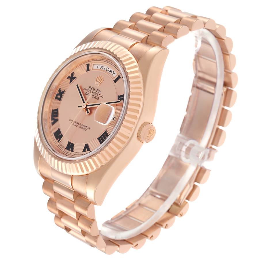 Replica Rolex Day-Date II Concentric Roman Dial Rose Gold Mens Watch 218235. Officially certified chronometer automatic self-winding movement. 18K rose gold oyster case 41.0 mm in diameter. Rolex logo on the 18k rose gold crown. 18K rose gold fluted bezel. Scratch resistant sapphire crystal with cyclops magnifier. Pink concentric guilloche dial with raised black Roman numeral hour markers and black-inlay rose gold baton hands. Date calendar window at the 3 o'clock aperture. Day window at 12 o'clock. Minute marker track around the outer rim. 18K rose gold president bracelet with a hidden clasp. Fits a 7 3/4" wrist.
