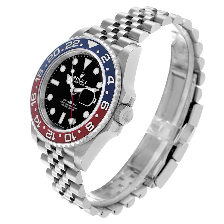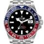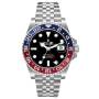 Bezel: Stainless steel bidirectional rotating bezel with a "Pepsi" blue and red ceramic bezel insert, engraved with the 24-hour graduation.