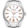 Replica Rolex Milgauss White Dial Steel Automatic Mens Watch 116400. Officially certified chronometer automatic self-winding movement. Stainless steel oyster case 40.0 mm in diameter. Rolex logo on the crown. Stainless steel smooth domed bezel. Scratch resistant sapphire crystal. White dial with luminescent-inlay steel baton hands and orange hour markers. Orange lightning bolt sweeping seconds hand. Outer orange minute marker track. Stainless steel oyster bracelet with an oysterlock clasp. Fits a 7 3/4" wrist.