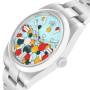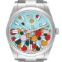 Dial: Turquoise blue celebration motif dial with steel luminescent baton hour markers and hands. Outer stick minute markers.